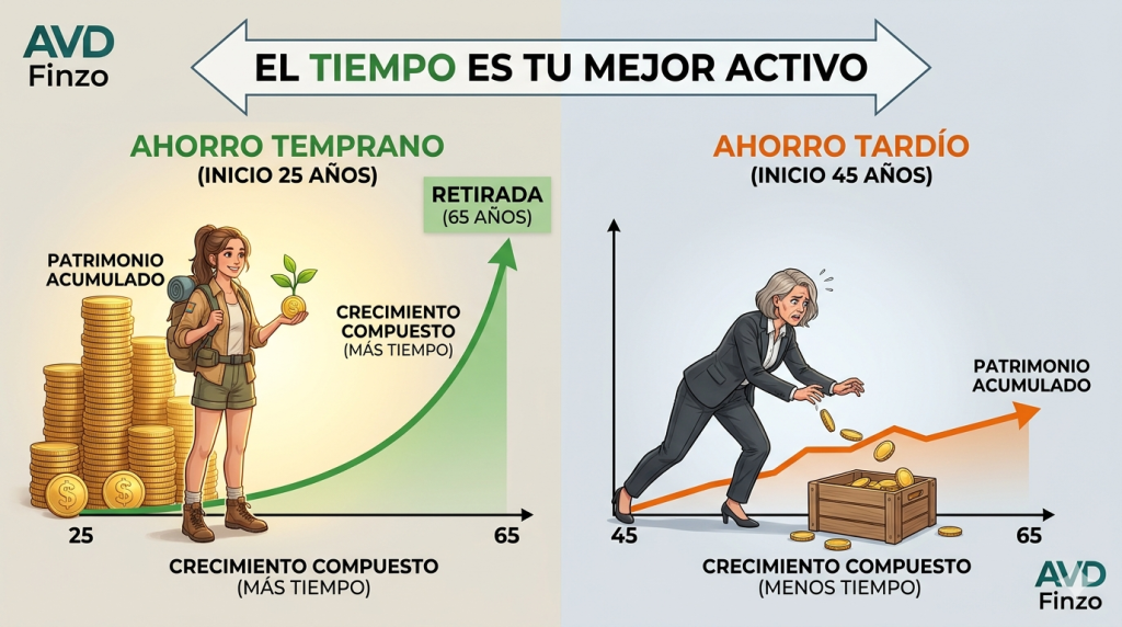 - Aprovechar el crecimiento del capital: Las inversiones a largo plazo pueden beneficiarse del crecimiento compuesto, lo que permite que el dinero genere rendimientos sobre los rendimientos anteriores. Como explicamos en nuestro post sobre el interés compuesto, el tiempo es tu mayor aliado: empezar 10 años antes puede duplicar tu capital final con el mismo esfuerzo